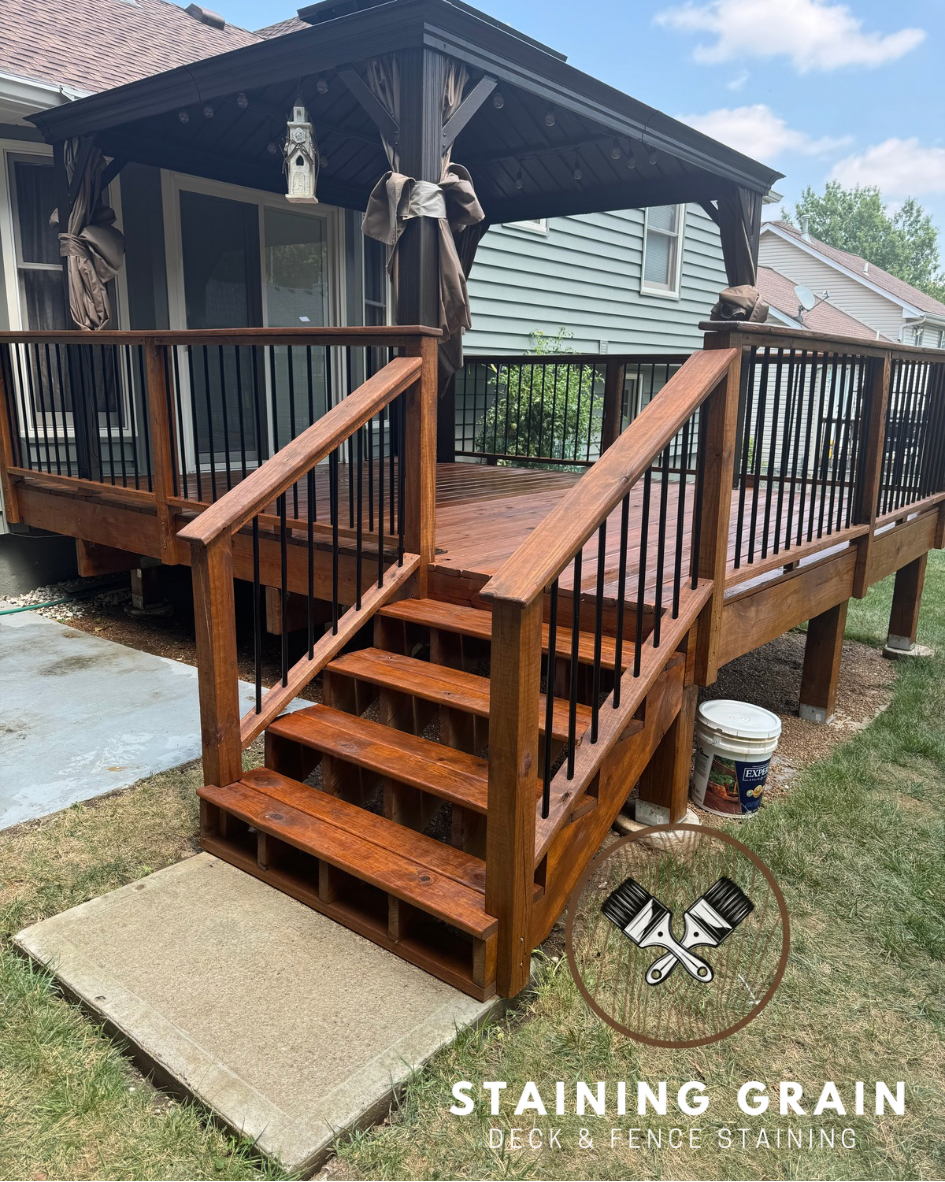 We use Stain & Seal Experts oil-based stain that keeps water out and delays the sun from damaging your wood.